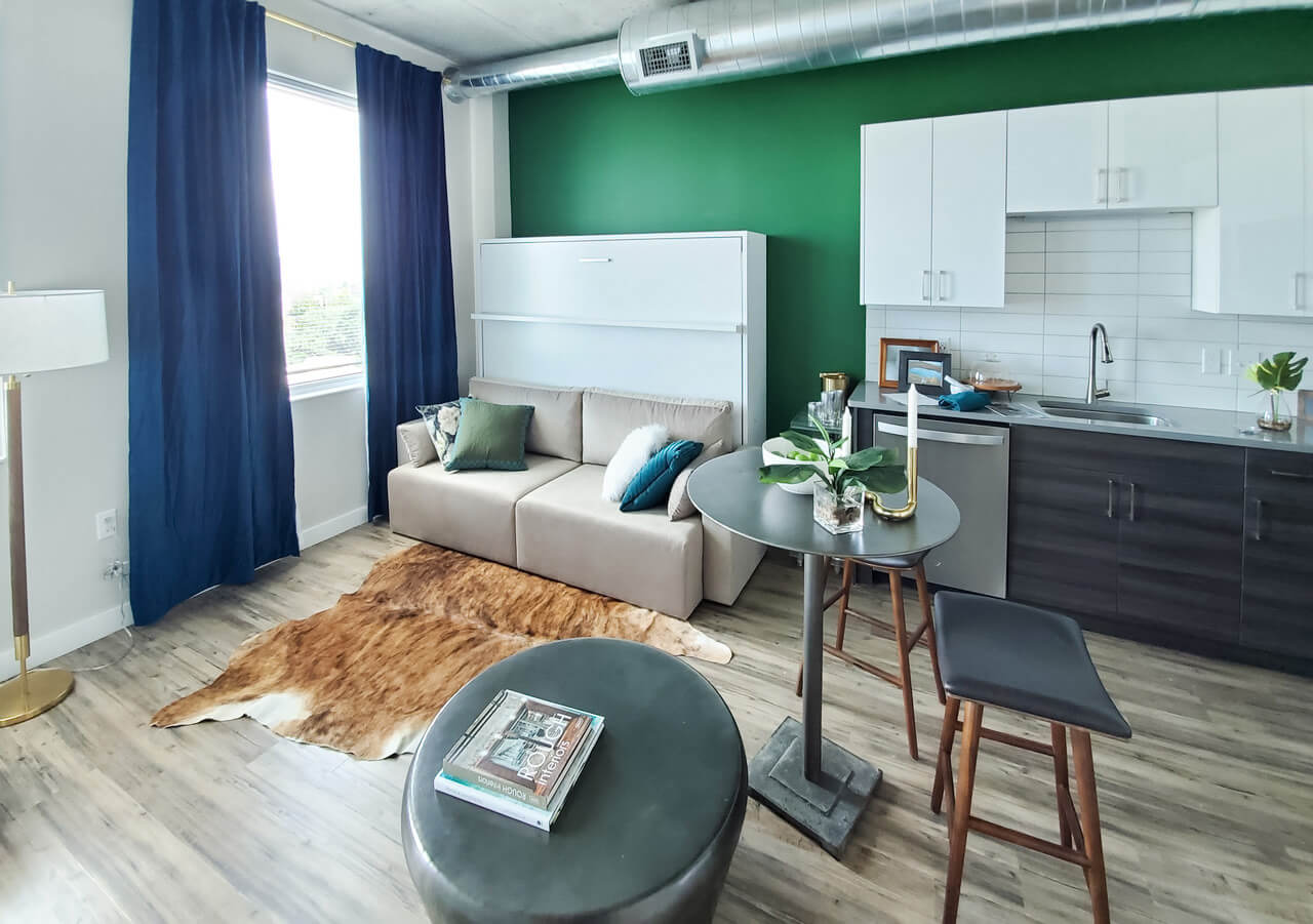 This industrial loft was in desperate need of a space-saving solution for seating and a queen size bed. To keep an open feel of the space we considered both vertical and horizontal queen size wall beds with an integrated 2-seat sofa.